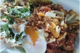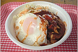 デミソースたっぷりジューシーハンバーグに半熟エッグとシャキシャキ野菜の丼ごはん。元祖「ロコモコ丼」。老舗ハワイアン、ホイホイ亭の味をお楽しみください。