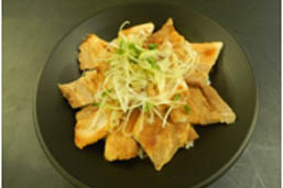 千葉のブランド豚「元気豚」の厚切りロース肉を味噌の名産地「佐倉」のお味噌がベースの特製味噌ダレに漬け、香ばしく焼き上げました。付合せにも千葉にこだわり、ほうれん草のピーナツ和えや成田名産鉄砲漬、館山名産玉黄金らっきょうを添えました。