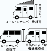 ピックアップトラックの荷台に搭載(脱着可能)するキャビンを架装したもの | 軽自動車の貨物車や乗用車をベースにキャンピングを目的として設計・製造したもの(8ナンバー取得は問わず。ただし軽自動車登録のこと) | けん引装置(ボールヒッチ、フィフスホィール)によって牽引されるシャシー(フレーム、車軸系などのみ)にキャビンを架装し製造したもの |